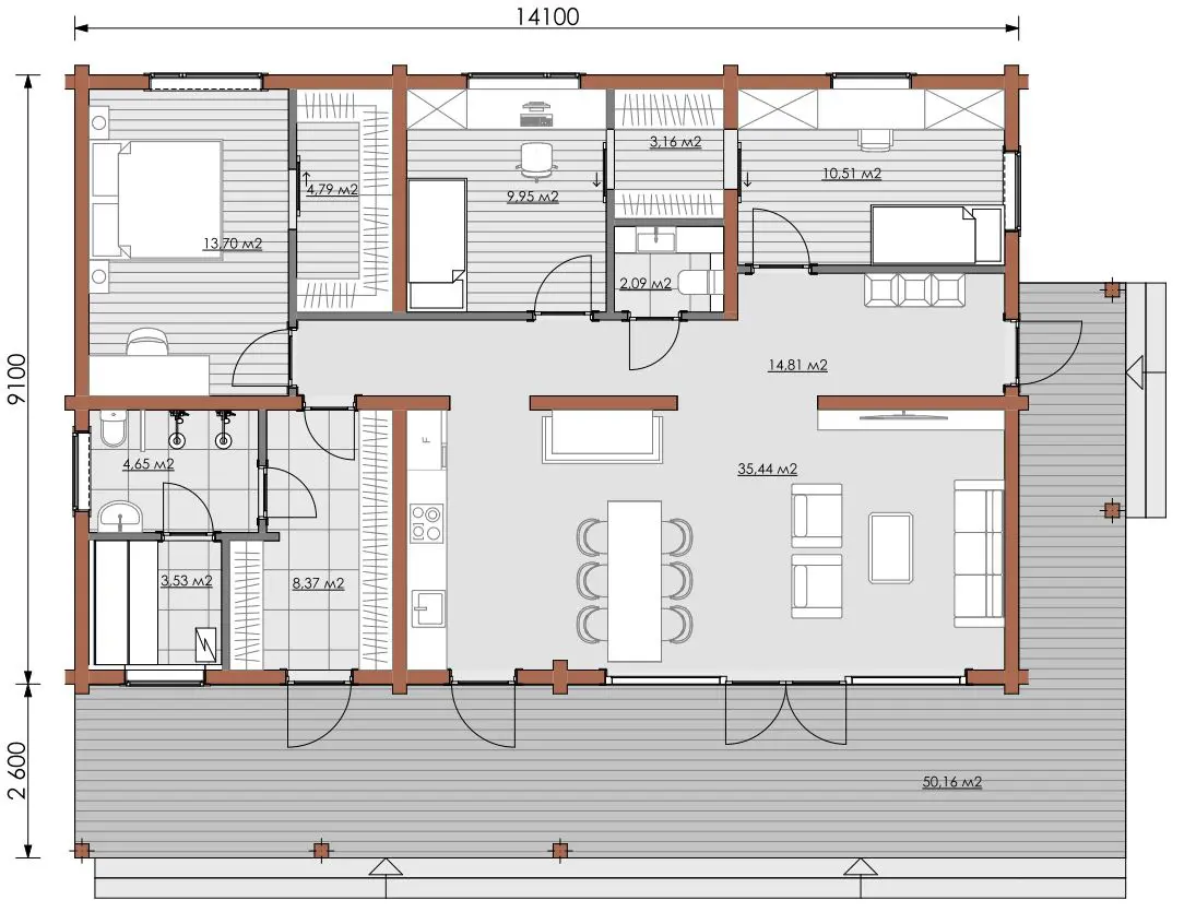 Standard kit includes: insulated (100 mm) floor and 28 mm. floorboards/decking, double glazed wooden windows and doors, insulated (150-200 mm) roof with bitumen shingle or RUUKKI paneling cover, trimmings etc.